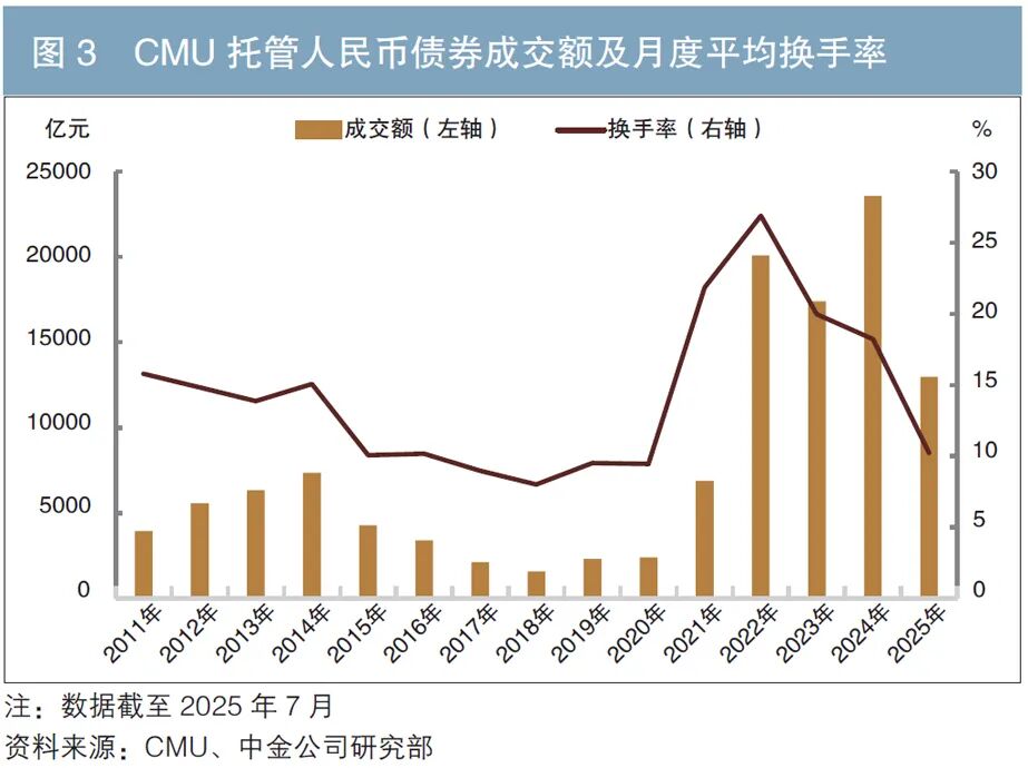 2021年9月,为了进一步加强两地债券市场基础服务机构的合作,债券南向通正式上线,是首个单独针对香港债券市场的投资渠道。南向通下的境内投资者范围暂定为经中国人民银行认可的部分公开市场业务一级交易商,同时拥有QDII和RQDII资格的投资者也可通过南向通开展境外债券投资。南向通的推出为内地机构投资者投资离岸债券提供了更加便捷的渠道,进一步促进了点心债市场的发展。2025年以来,为深化香港和内地金融合作,南向通相关制度进一步完善。1月,中国外汇交易中心新增南向通下上海清算所结算的美元、欧元币种债券交易服务,并将通过上海清算所结算的南向通T+1交易时间延长至16∶30。此外,香港金管局与中国人民银行先后宣布深化香港和内地金融合作的多项新措施,主要包括将进一步扩大南向通下的合格境内投资者范围至券商、基金、保险、理财等四类非银机构等。